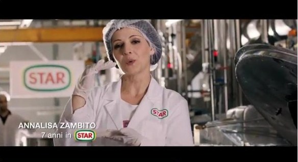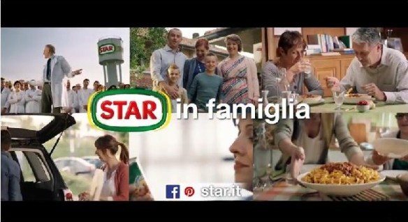 Ma soprattutto è accompagnata, sul finale, da un mosaico di sei immagini: il direttore che, con fare paterno, parla ai dipendenti, mentre in alto, su un enorme silos, campeggia il logo Star, una simpatica famigliuola con tre adulti e due bambini, una coppia di mezza età a tavola, una donna che apre il portabagagli (evidentemente all’uscita da un supermercato), un’altra che prende il barattolo del ragù e infine un bel piatto di spaghetti posato sul tavolo.
