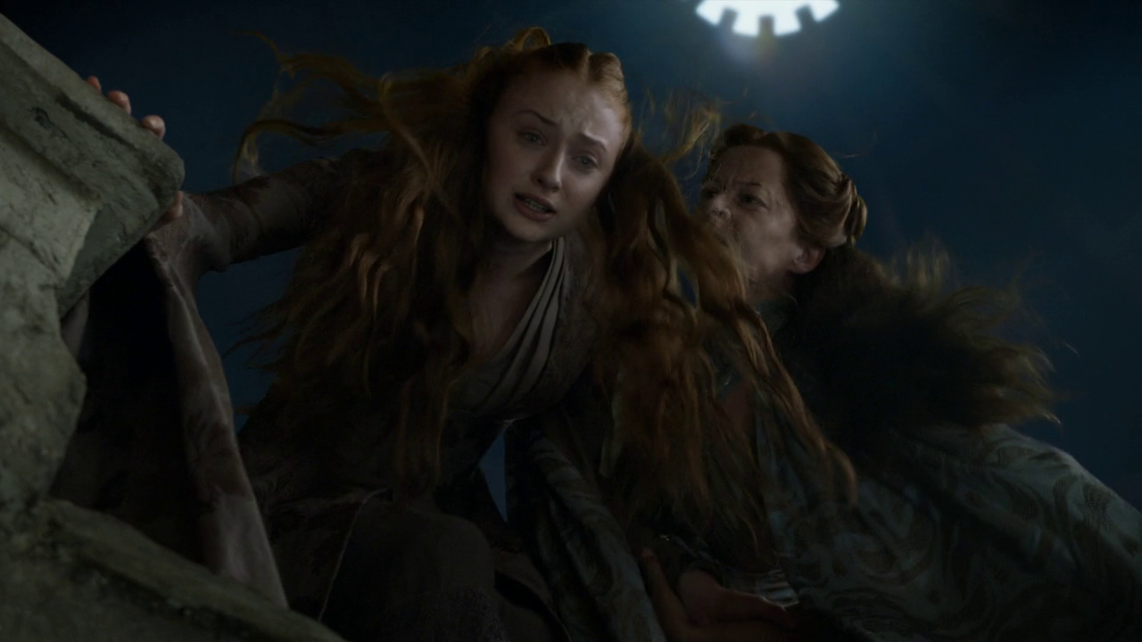 La scena successiva, infatti, vede la la nostra Einstein Dai Capelli Rossi mentre cerca di difendersi dalla zia che sta per lanciarla giù dalla porta della luna. Ma, come sappiamo, difendersi non è il suo forte (a proposito, ci stiamo ancora chiedendo tutti quale sia, forse mangiar torte al limone), e quindi ecco che, suadente come solo lui sa essere, interviene Lord Baelish che riesce a fermarla.