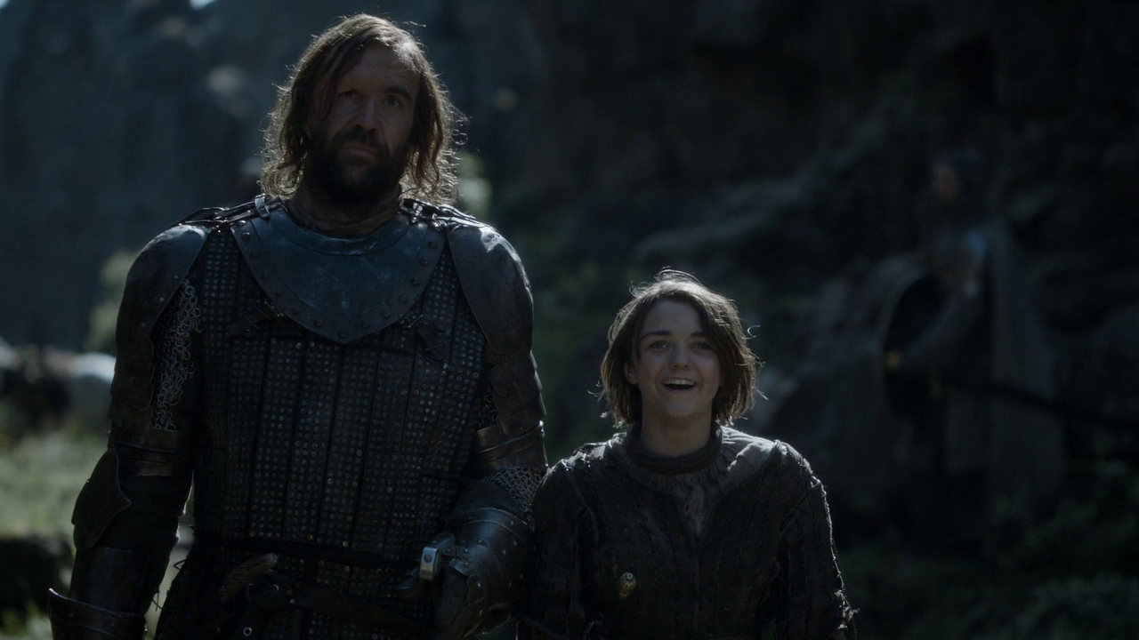 Ma le novità non sono finite a Nido dell’Aquila, perché alle porte ci sono Arya ed Il Mastino, che parlano di omicidi con aria da teneroni. Ma Il Mastino è felice soprattutto perché si aspetta il riscatto da Lysa. Così, quando vengono a sapere della sua morte, lui rimane con la faccia da baccalà, mentre Arya si scompiscia dalle risate rischiando una freccia in pancia da qualche soldato fedele particolarmente sensibile.