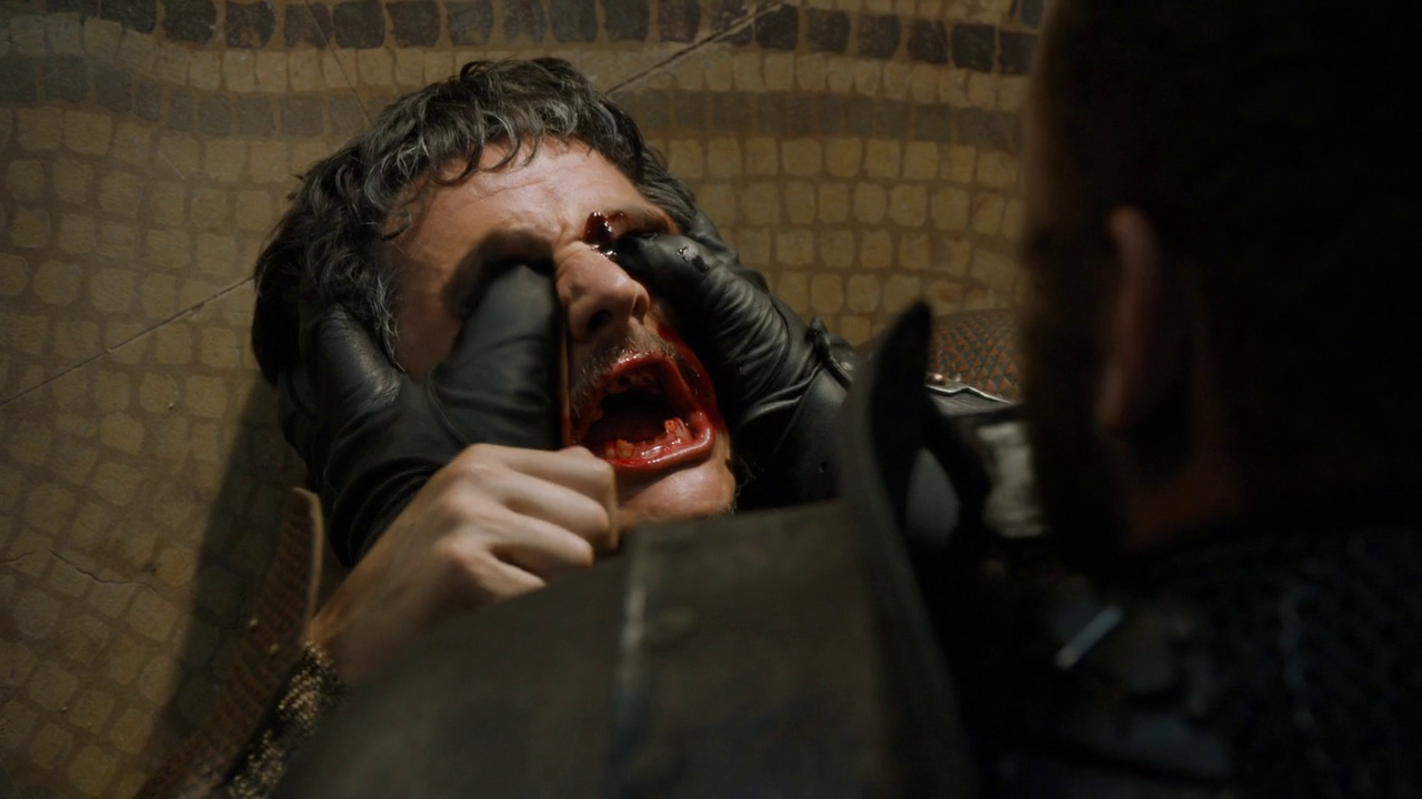 Poi schiacciandogli gli occhi con le dita grida: “Elia Martell, ho ucciso i suoi figli, poi l’ho stuprata e le ho sfondato la testa in questo modo!“. Un attimo dopo sfonda il cranio di Oberyn e crolla.