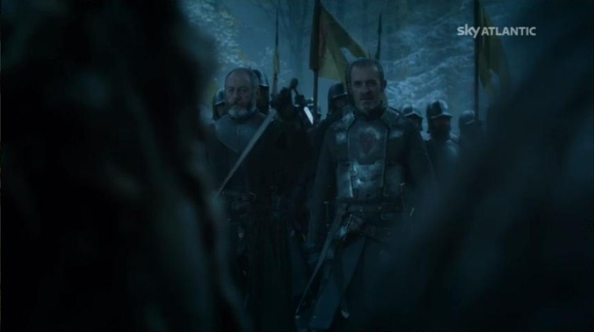 Infatti, mentre i due continuano a bere come fossero vecchi amici (mancano solo le pacche sulle spalle da ubriaconi!), arriva l’esercito di Stannis Baratheon che stermina gli uomini di Mance (i centomila continuano a non vedersi manco all’orizzonte) e ne cattura i capi.