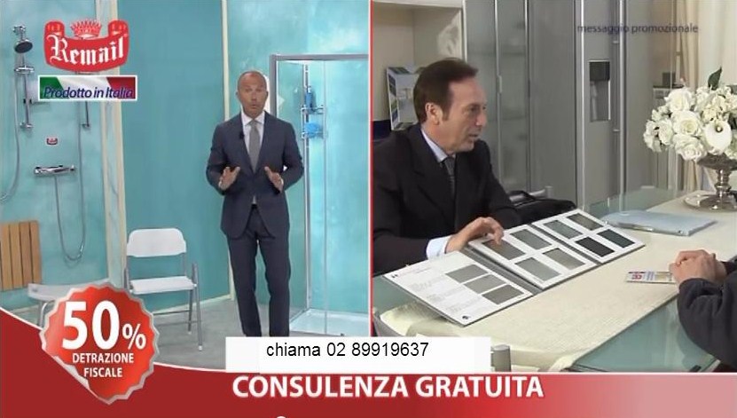 E poi, insiste, questa doccia Remail ha degli accessori incredibili: la “seggiola fatta apposta da Remail” (ovviamente non da un falegname, ma da un architetto), “la maniglia antiscivolo” (tipo autobus, che sciccheria!),  l’apertura ampia “per le persone magari un po’ più sovrappeso,o per quelle che vogliono entrare con gran comodità nella propria doccia.” (praticamente ci passa un tir), perfino “il rubinetto che in qualsiasi momento ti fa mettere acqua calda o fredda” (capito che tecnologia? Non come voi che l’acqua la scaldate ancora sul fuoco  poi la buttate nella vasca!).