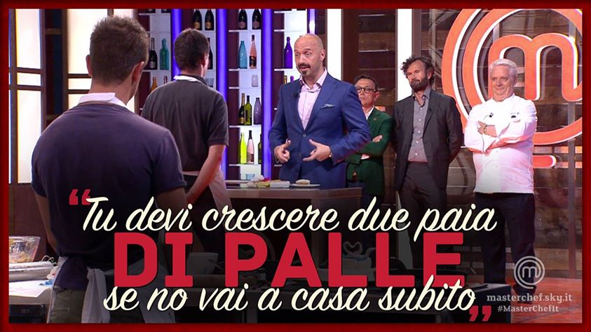 Intanto Bastianich disintegra Paolo: “la problema con te, Paolo, è chi tu vieni qui quando fai una merda come questa torta con i ochi bassi, tutto triste, quando fai qualcosa figo sei alegro! E questo a me non mi piace, perché io ti dico come lo vedo: questa torta è una merda e tu devi crescere due paia di palle se no vai a casa, subito, secanda me, ok?”