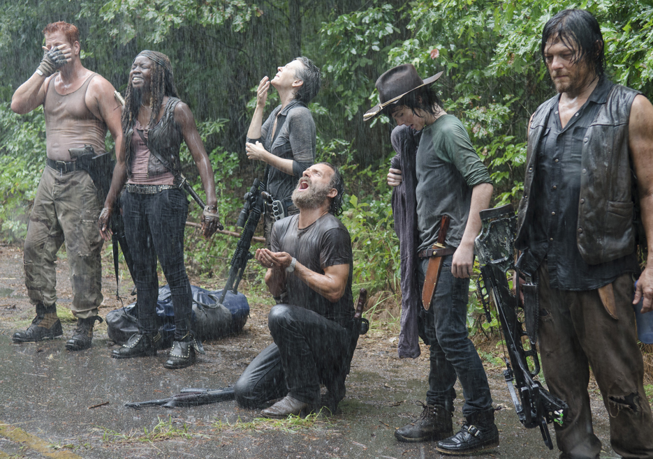 Però le preoccupazioni del gruppo rimangono il cibo e l’acqua che ormai scarseggia. Il primo problema lo risolvono cibandosi di cani randagi e decisamente poco docili, mentre per quanto riguarda l’acqua, s’imbattono in diverse bottiglie piene d’acqua lasciate per strada, con un biglietto con la scritta “da un amico”. Ma il gruppo chiaramente non si fida e quando Eugene decide di assaggiarla Abraham lo ferma. Il problema comunque si risolve da solo perché inizia a diluviare. La pioggia però non sembra passeggera e il gruppo si rifugia in un fienile.