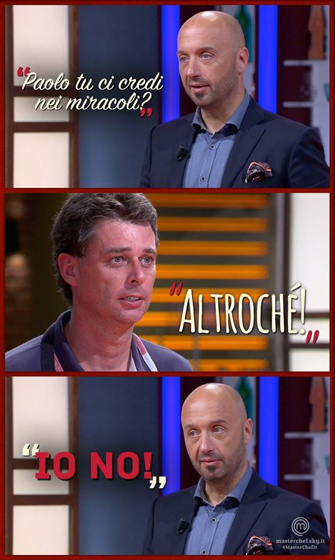 Paolo, sveglio come sempre, è convinto di venir giudicato da tre “chef stellati”. Cracco lo guarda basito: “ma quali chef stellati? Sono ispettori!”. E lui: “Sì ma mangiano in tutti gli chef stellati, mand… mang… mangiano comunque in un sacco di ristorant…mangiano comunque in un sacco di ristoranti stellati!”. Il che fa di loro, evidentemente, degli chef stellati.
