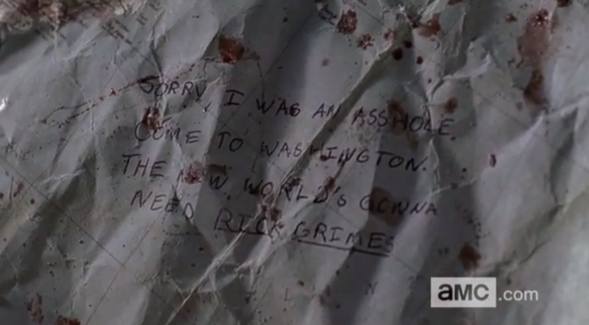 Dopo essersi messi in salvo, Aaron propone a Morgan di seguirli ad Alexandria, ma lui rifiuta e chiede loro di aiutarlo ad orientarsi sulla mappa. Così Daryl riconosce la scritta che Abraham aveva lasciato a Rick nella mappa che Morgan aveva trovato nella chiesa poco dopo la loro fuga.
