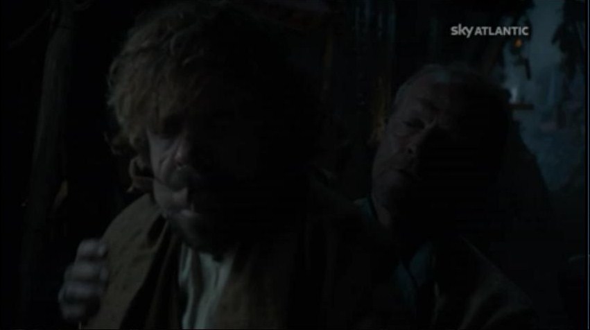 Così rinuncia e va a farsi una bella pisciatina dal terrazzo. Un po’ un amarcord di quando era ricco e libero, e pisciava dalla Barriera! Ma, alle sue spalle, arriva Jorah l’Andalo che lo rapisce.
