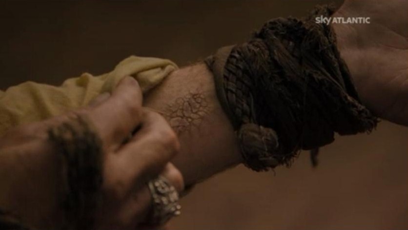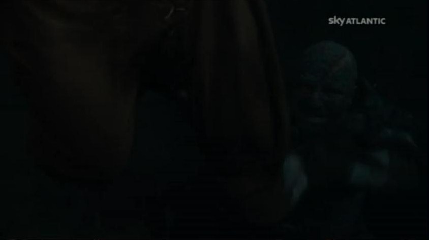 – I due vengono assaliti dagli Uomini di Pietra (quelli che hanno contratto la malattia di Shireen, ma non avevano il padre ricco che li portasse nella clinica privata a guarire, e si sa come vanno le cose negli ospedali pubblici).