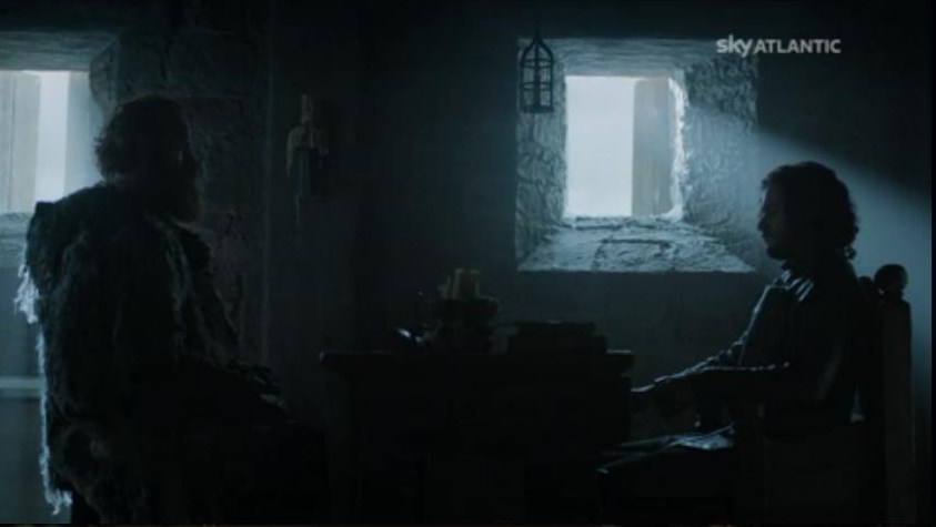 Al Castello Nero, intanto, il dialogo tra Mastro Aemon e Sam viene interrotto da Jon, che, da quando è Lord Comandante, fa lo snob e parla a tutti in privato.